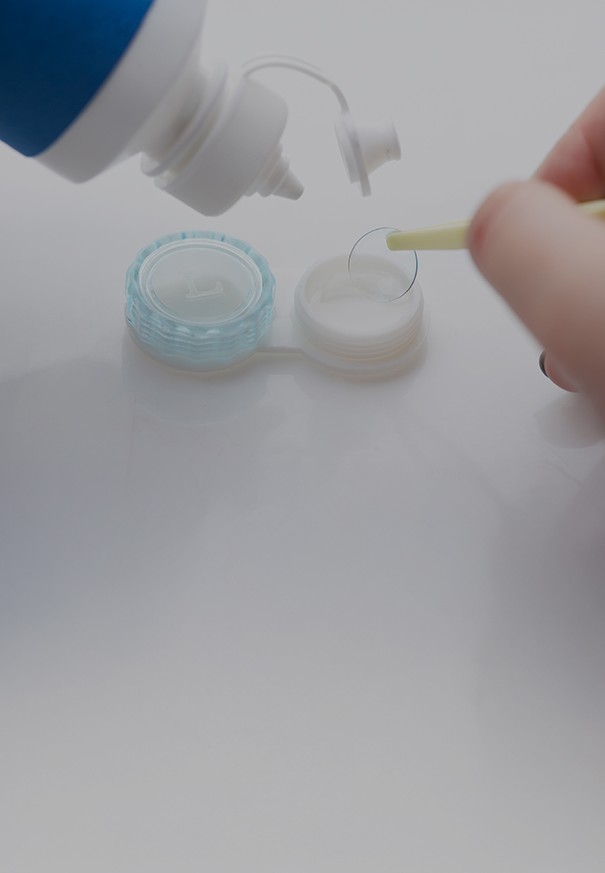 보존액을 넣은 렌즈 케이스에 렌즈를 넣어 보관합니다. (세척액으로 매일 세척하고, 보존액은 매일 교체합니다.)